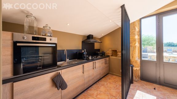 - Une cuisine équipée avec notamment : bouilloire électrique, four, four à micro-ondes, grille-pain, lave-vaisselle, plaques de cuisson...
