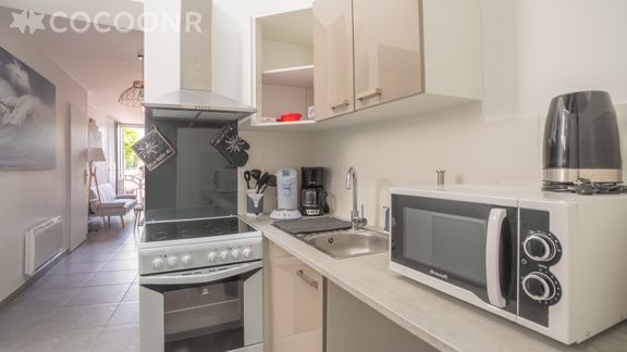 - Cuisine fonctionnelle et entièrement équipée avec : four, plaques de cuisson, réfrigérateur, grille-pain, bouilloire électrique, cafetière Senseo et cafetière à filtres, vaisselle et couverts...