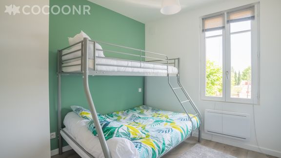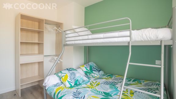 - Chambre 2 : un lit superposé (lit double (140x190) en bas et lit simple en haut) et une penderie