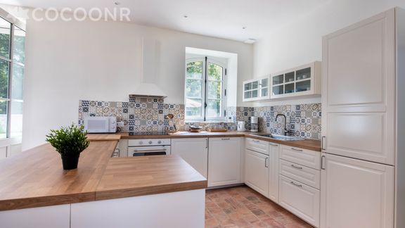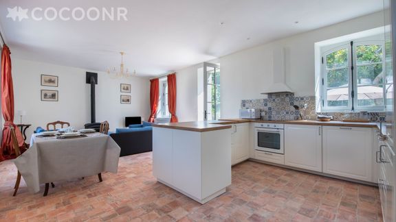 - Une cuisine ouverte équipée avec notamment : bouilloire électrique, four, four à micro-ondes, grille-pain, lave-vaisselle, plaques de cuisson, cafetière à dosettes Nespresso, Magimix...