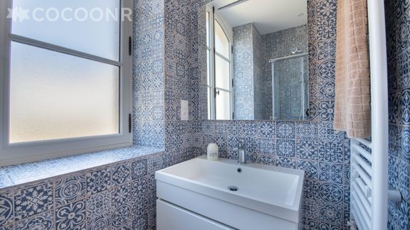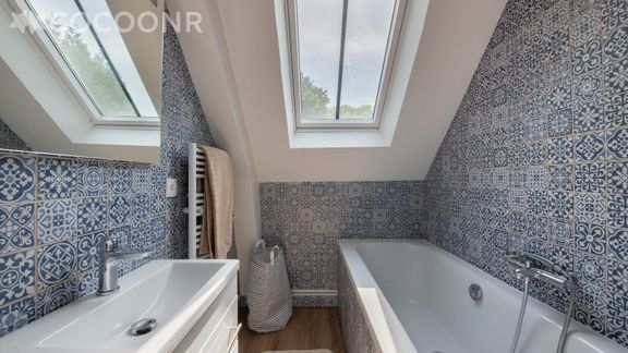 - Une salle de bain avec baignoire et WC sanibroyeur