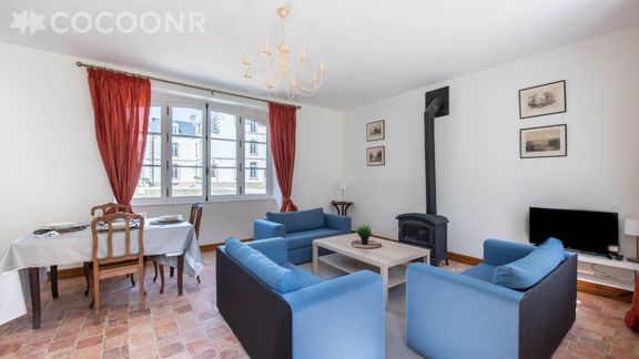 - Une pièce de vie de 40 m² avec TV, poêle, canapés et espace salle à manger.