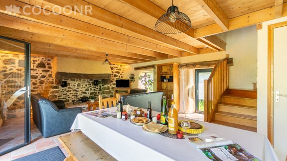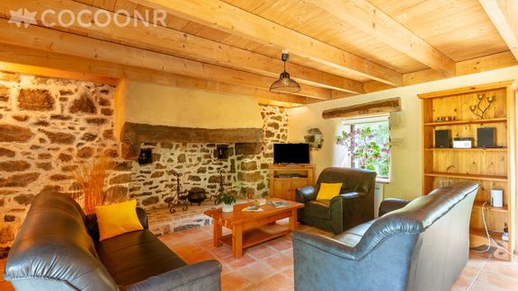 - Une pièce de vie de 40 m² avec TV, poêle à bois dans la grande cheminée, canapés, fauteuil, table basse et espace repas.