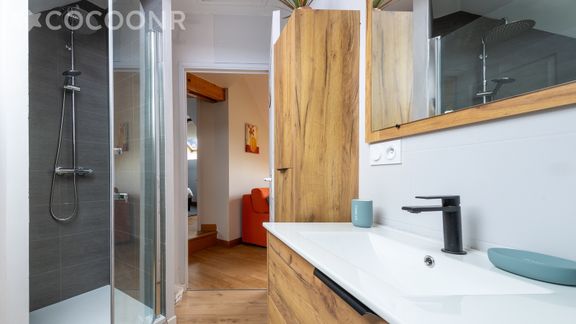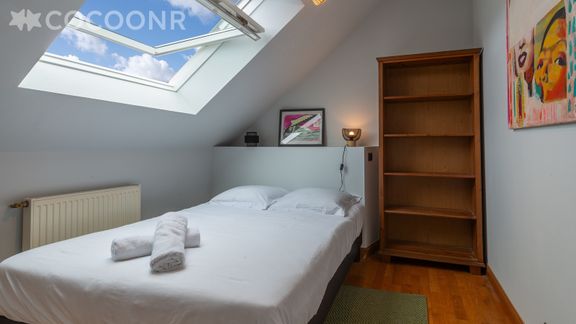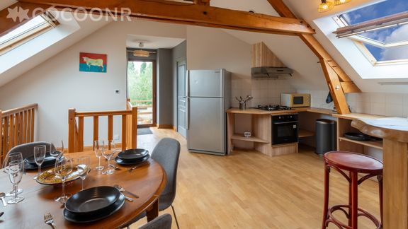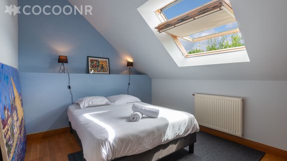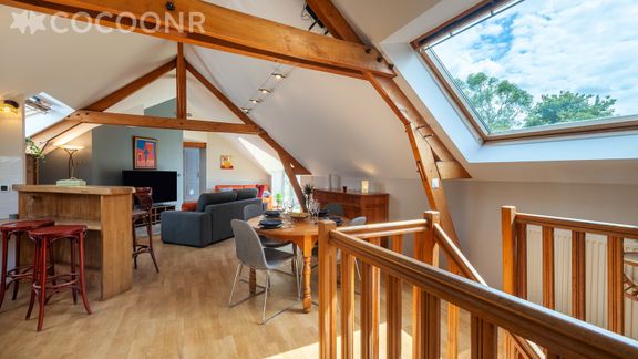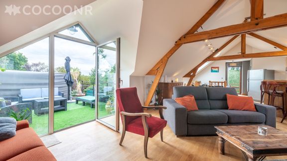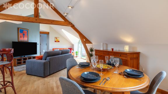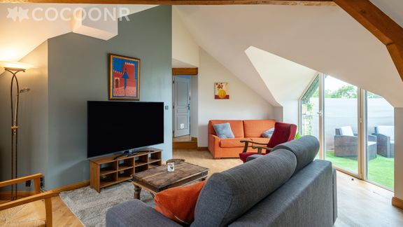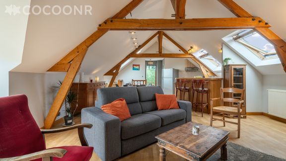 - Une pièce de vie mansardée avec espace salon (TV et canapé-lit double)