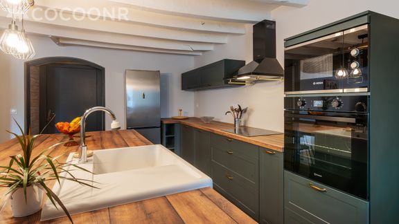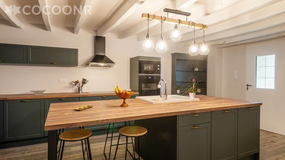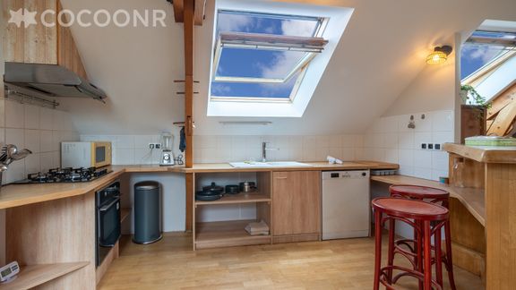 - Une cuisine ouverte équipée avec notamment : four, micro-ondes, lave-vaisselle, plaques de cuisson...