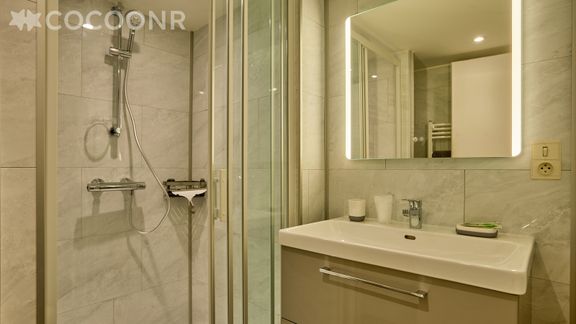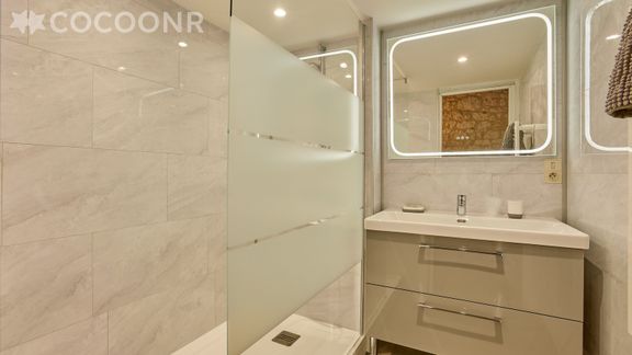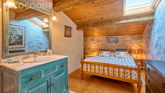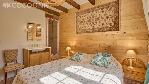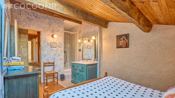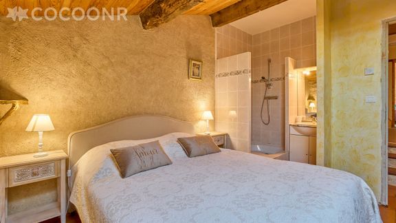 - Chambre 1 : avec 1 lit double (140×190) et sa salle d'eau ouverte (avec douche, lavabo) et WC