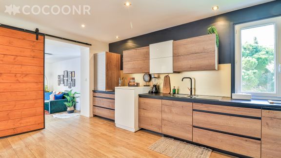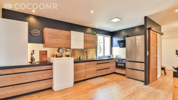 - Une cuisine spacieuse et ouverte sur l'espace salon et salle à manger, entièrement équipée : four, lave-vaisselle, plaques à induction, grand réfrigérateur, micro-onde, bouilloire, grille-pain, cafetière Senseo etc...
