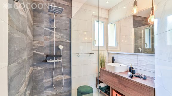 - Une salle d'eau avec douche à l'italienne, un lavabo, un grand miroir, étendoir et sèche-cheveux.