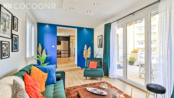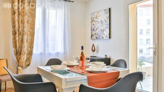 L'appartement est situé dans un quartier calme à l'esprit village à environ 100 m d'un grand boulevard ou vous trouverez de nombreux commerces : supérette, bars, restaurants, marché, poste, pharmacie, boulangerie, boucherie.. De plus, la mer se trouve à seulement 300 m avec, sur votre chemin, un parc de jeux pour enfants.
