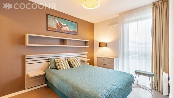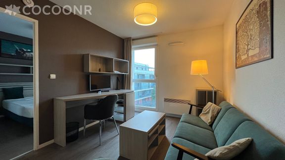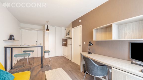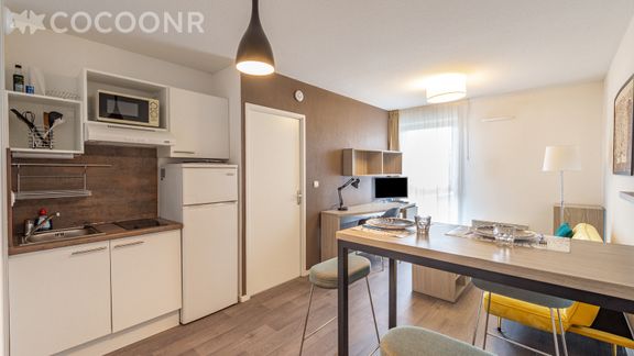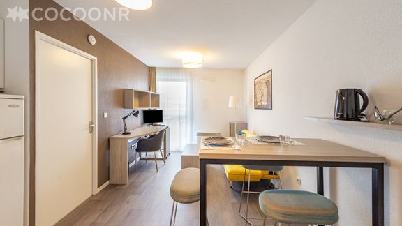 Idéal pour des séjours longue durée (étudiants, collaborateurs en déplacement), ce pied-à-terre dispose de tout le confort nécessaire: un salon séjour lumineux, une kitchenette entièrement équipée et ouverte sur le salon, une chambre, une salle d'eau, wifi. Une cour intérieure, une laverie partagée et un local vélo sécurisé accessibles, partagés avec les autres résidents.