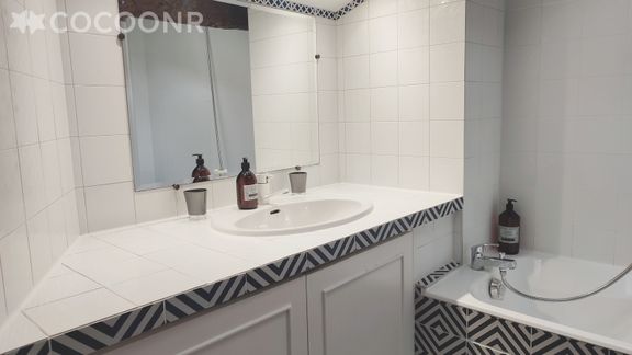 - Une salle de bains avec baignoire, machine à laver, sèche-cheveux. WC séparé.
