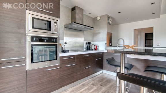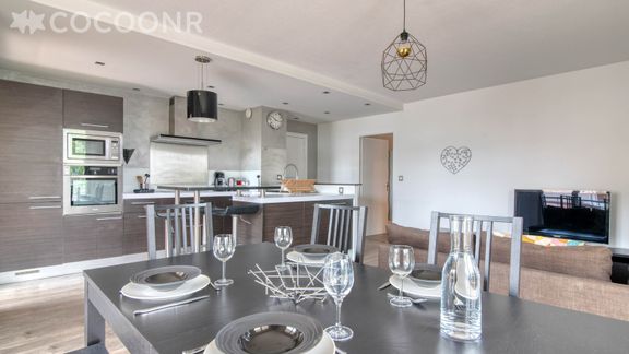 - Une cuisine équipée avec notamment : bouilloire électrique, machine à café Senseo, four, four à micro-ondes, grille-pain, lave-vaisselle, plaques de cuisson...