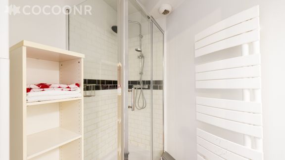 - Une salle d'eau avec douche, lavabo, miroir et tiroirs