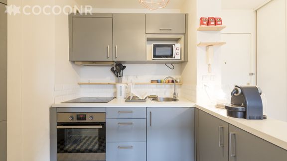- Une cuisine équipée avec notamment : bouilloire électrique, grille-pain, plaques de cuisson, réfrigérateur, four à micro-ondes, four, cafetière...