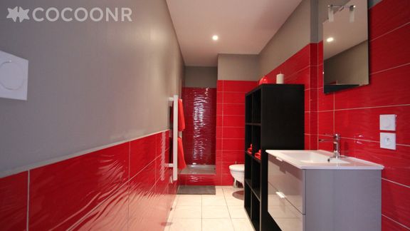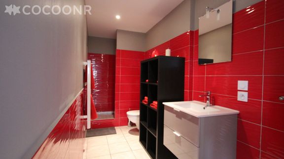 - Une salle d'eau avec une douche à l'italienne, un lavabo avec miroir, un placard de rangement et des toilettes.