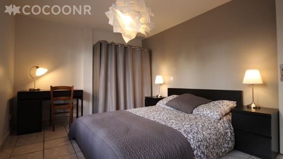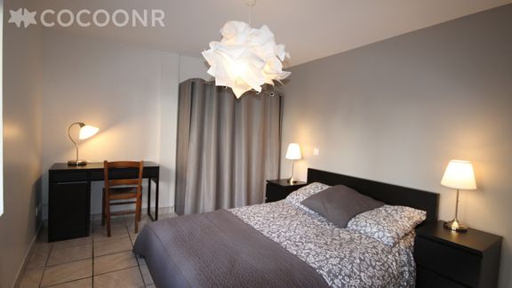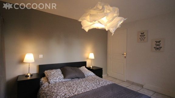 - Une chambre composée d'un lit double en 140, 2 tables de chevet avec des lampes d'ambiance. Une armoire est disposée pour déposer toutes vos affaires. Pour les professionnels, vous pourrez utiliser le bureau avec sa chaise.