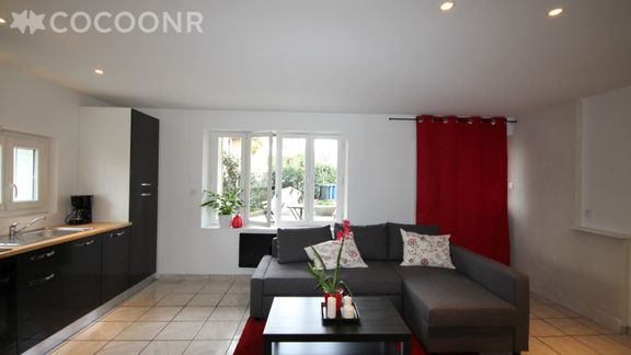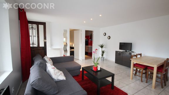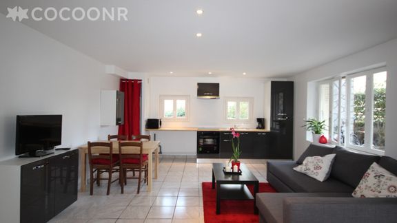 - Un séjour lumineux avec un canapé d'angle convertible 2 places, une table basse, une télévision, une table et 4 chaises pour prendre ses repas.
