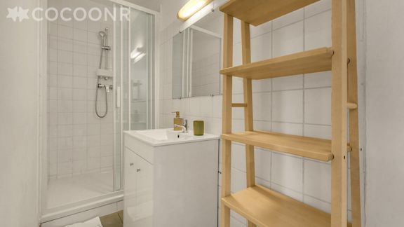 - Salle d'eau avec une douche, un meuble vasque, des rangements, un sèche-cheveux et des WC