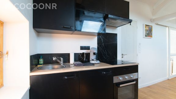 - Une cuisine équipée avec notamment : bouilloire électrique, four, four à micro-ondes, lave-vaisselle, plaques de cuisson...