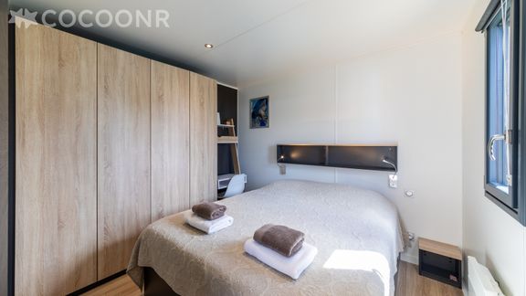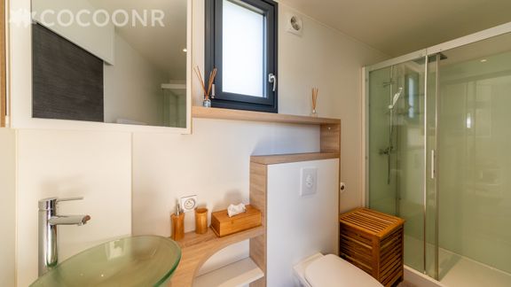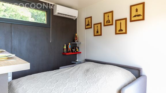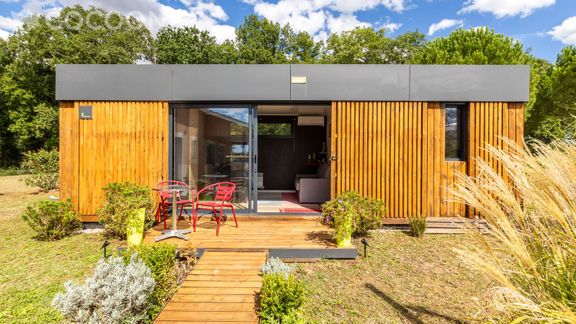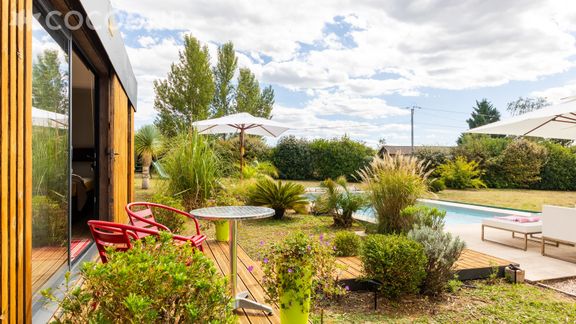 - Une terrasse en bois de 12 m² sur un terrain partagé 6 000 m² avec salon de jardin, lit de bain et parasol pour profiter des beaux jours. Elle est également équipée de deux prises extérieures.