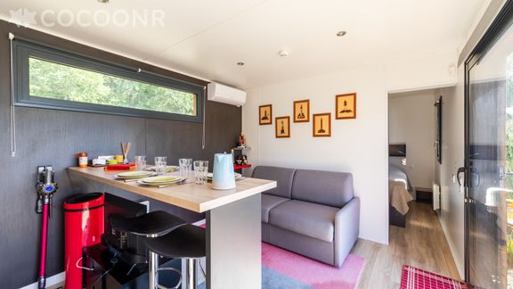 - Une pièce de vie de 14 m² avec TV, canapé-lit double et espace repas