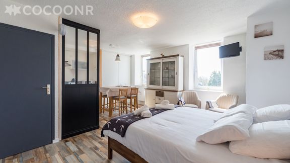 - Une pièce de vie lumineuse de 30 m² avec TV, penderie et coin nuit avec un lit queen-size (160×200) et son matelas de haute densité (30 cm)