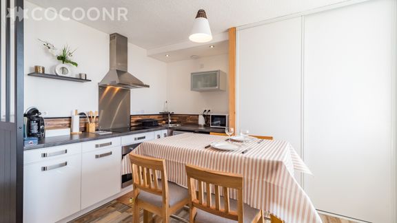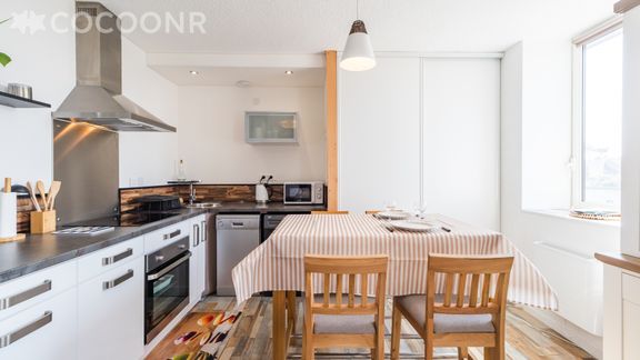 - Une cuisine équipée avec notamment : bouilloire électrique, four, four à micro-ondes, grille-pain, lave-vaisselle, plaques de cuisson...