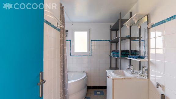- Salle de bain avec baignoire, lavabo, sèche-cheveux, rangements.