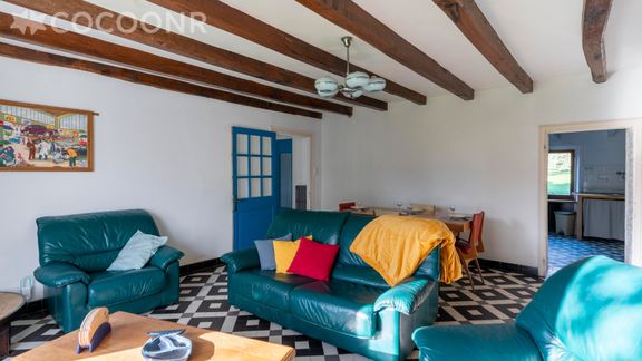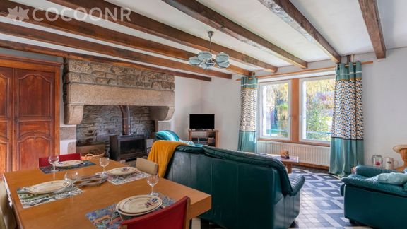 - Grande séjour-salon plein de charme avec ses poutres apparentes et sa cheminée. Vue sur le jardin depuis les baies vitrées. Un coin salon est aménagé avec des canapés, une table basse, la télévision, le tout autour de la cheminée en pierre. La table à manger familiale vous permettra de profiter de repas conviviaux.
