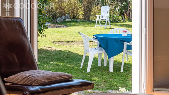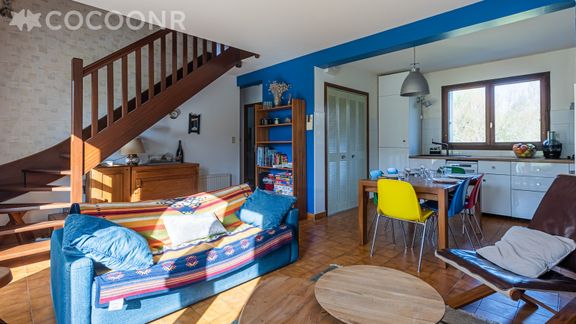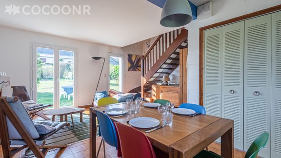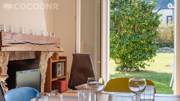- Un grand salon-salle à manger avec un canapé, deux fauteuils, une table basse, une table à manger pouvant accueillir jusqu'à 6 convives, une cheminée ainsi qu'un accès direct au jardin par une grande porte vitrée.