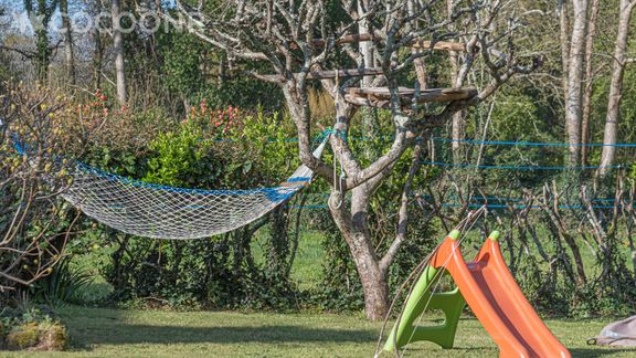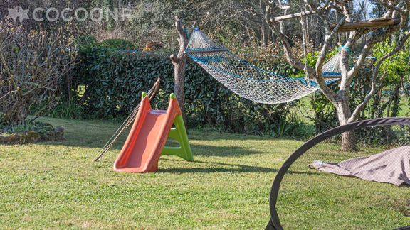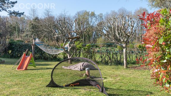 - Un grand jardin privé et arboré de 700 m² avec une double exposition nord/sud, vous pourrez ainsi profiter du soleil tout au long de la journée ! Vous aurez à disposition : un hamac et deux coussins de type « fatboy » pour flâner, un salon de jardin pour se reposer, une table, des chaises et un parasol, un petit toboggan pour enfants, un barbecue Weber trois feux pour vos grillades terre ou mer, but de foot.