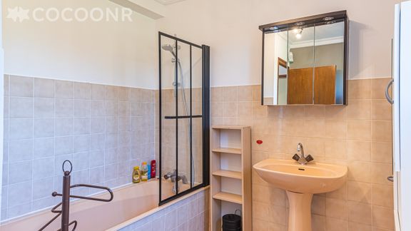 - Une salle de bain avec baignoire, lavabo, rangements, portant et sèche-cheveux.