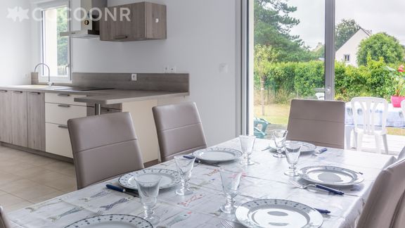 - Espace salle à manger avec une grande table familiale pour 6 personnes