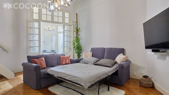 - Une pièce de vie avec TV écran plat 120 cm, un canapé et un canapé-lit double