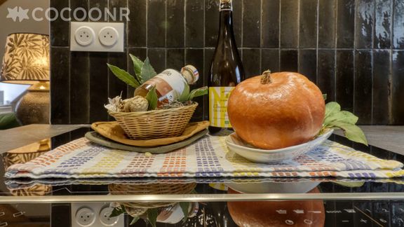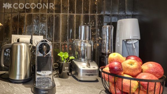 - Une cuisine équipée avec notamment : bouilloire électrique, four, four à micro-ondes, grille-pain, lave-vaisselle, plaques de cuisson...
