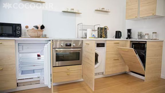 - Une cuisine ouverte équipée avec notamment : four, lave-vaisselle, plaques de cuisson...