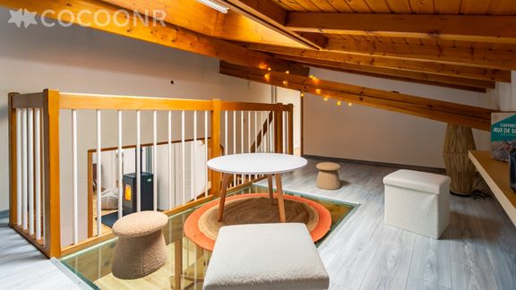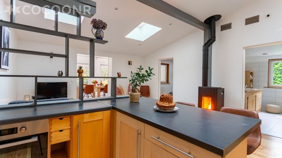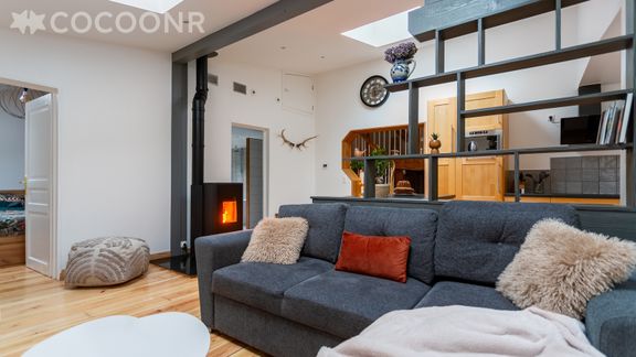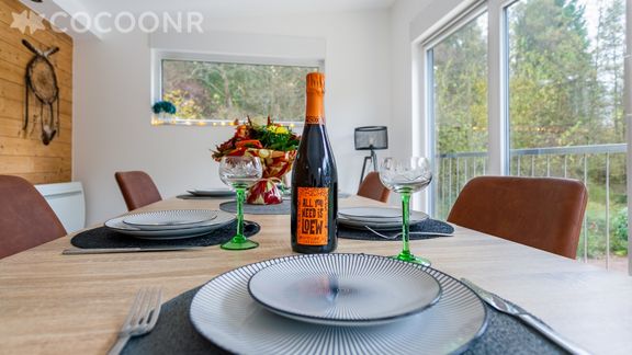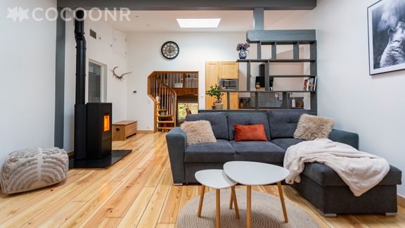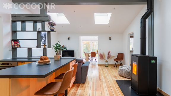 - Une pièce de vie de 30 m² avec canapé-lit double, TV, poêle à granulés (granulés compris pour le séjour) et salle à manger