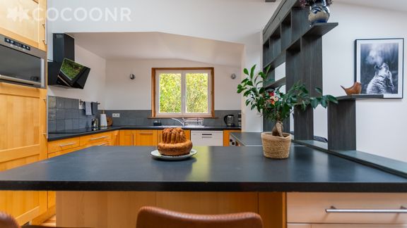 - Une cuisine équipée avec notamment : bouilloire électrique, four, four à micro-ondes, grille-pain, lave-vaisselle, plaques de cuisson...