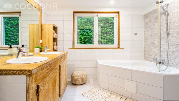 - Une salle de bain avec baignoire et doubles vasques et WC