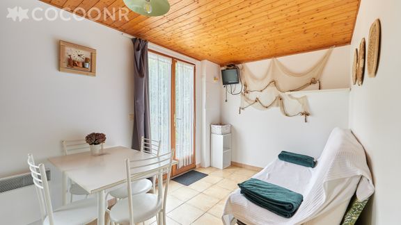 - Une pièce de vie de 14 m² avec TV, un canapé-lit double et un coin repas