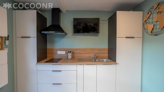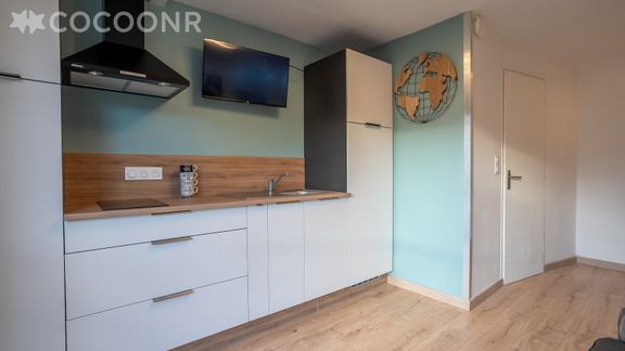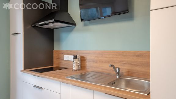 - Une pièce de vie avec TV, canapé et une cuisine équipée avec notamment : bouilloire électrique, four à micro-ondes, plaques de cuisson...