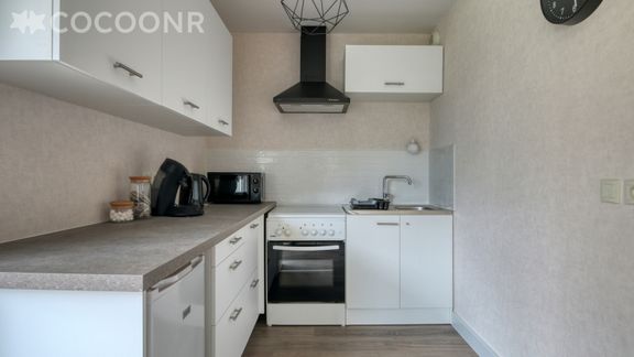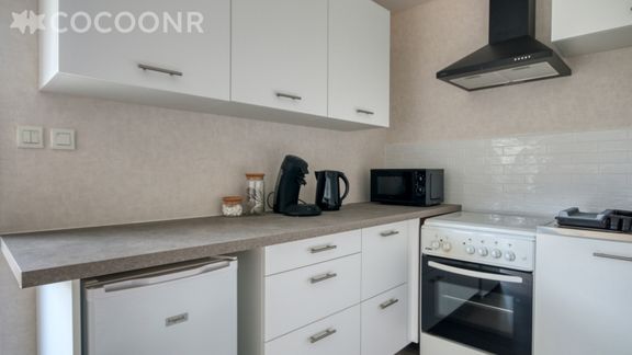 - Une cuisine équipée avec notamment : bouilloire électrique, four, four à micro-ondes, grille-pain, plaques de cuisson...