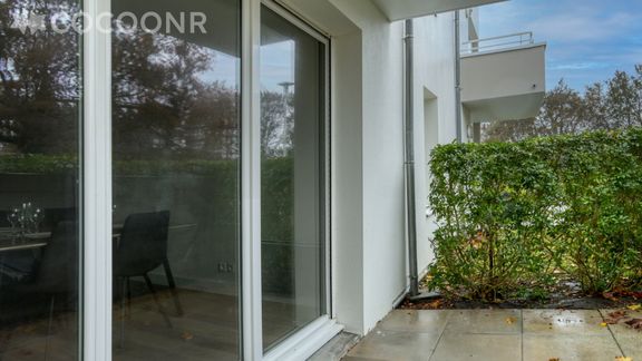 - Une terrasse 8m², exposé Est avec une table et deux chaises pour profiter d'un extérieur fermé par des clôtures à lame et une haie végétal.