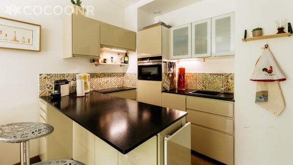 - Une cuisine ouverte équipée avec notamment : bouilloire électrique, four, four à micro-ondes, grille-pain, lave-vaisselle, plaques de cuisson, cafetière à dosettes Nespresso...