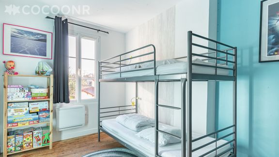 -Chambre 2 : Idéale pour deux enfants, elle est dispose d’un lit superposé, constitué de deux couchages aux dimensions de 90 x 190 cm et d’un lit d’appoint aux dimensions de 90 x 190 cm.