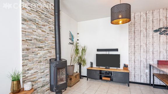 - Salon-salle à manger aménagé avec canapé, table basse, TV, lecteur DVD, barre de son, un poêle à bois ainsi qu'un espace repas avec une grande table conviviale. Bois de chauffe non fourni.
