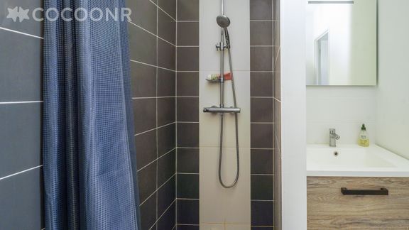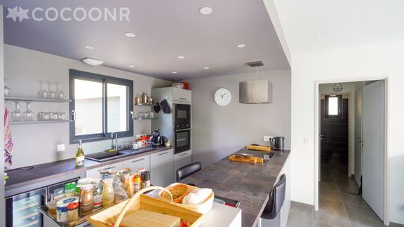 - Une cuisine américaine, ouverte sur le séjour, équipée avec notamment : bouilloire électrique, four, four à micro-ondes, grille-pain, lave-vaisselle, plaques de cuisson...