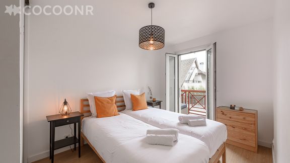 - Chambre 1 : 2 lits simples, rangements et accès balcon.