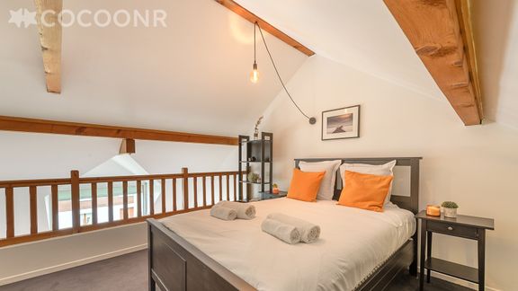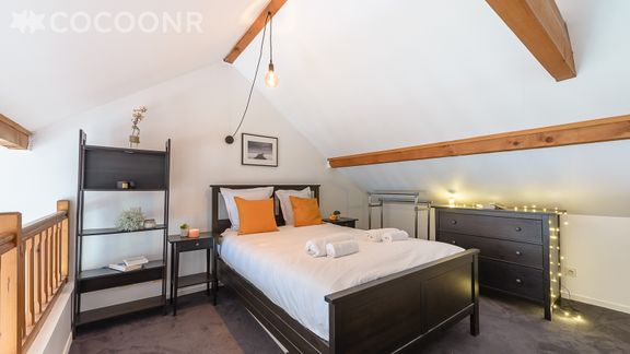 - Chambre 2 en mezzanine (ouverte sur le salon) : un lit double.