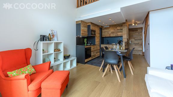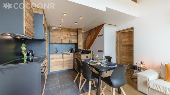- Pièce de vie lumineuse avec cuisine équipée et coin repas pour 4 personnes.